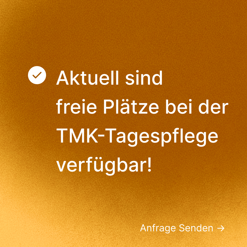 Unsere TMK-Tagespflege bietet tagsüber herzliche Betreuung in einer familiären Atmosphäre, um Pflegebedürftige zu unterstützen und Angehörige zu entlasten.